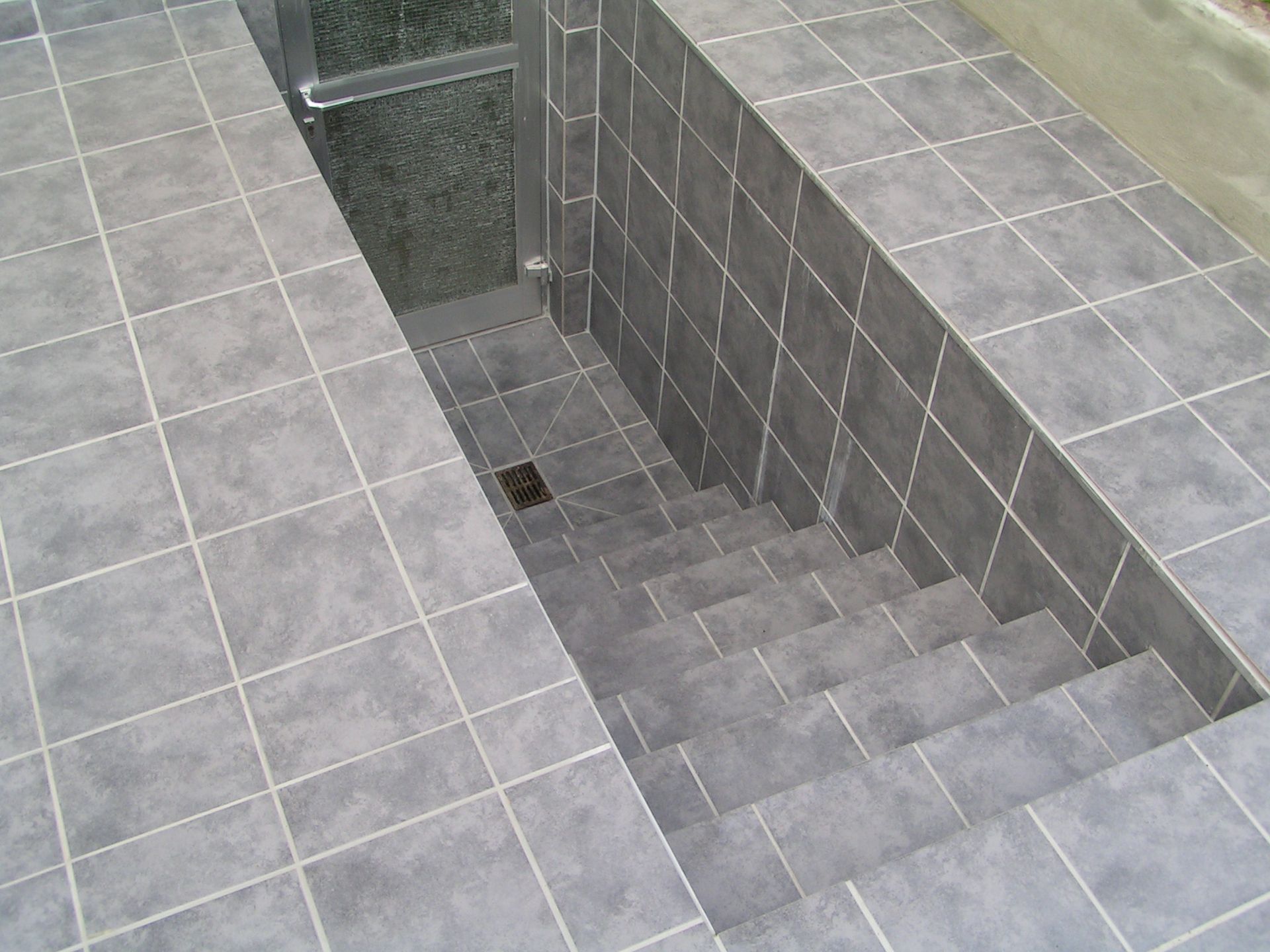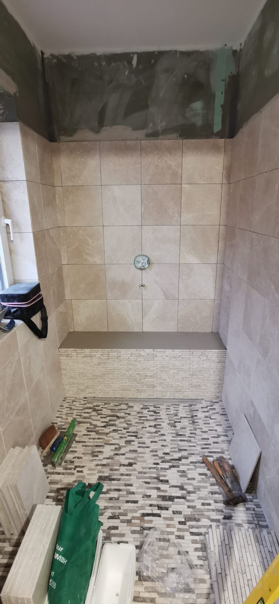 Badneugestaltung mit Duschbereich, Sitzmöglichkeiten, Abgemauert mit Natursteinverblendung, Mosaiknatursteinboden in Beckingen