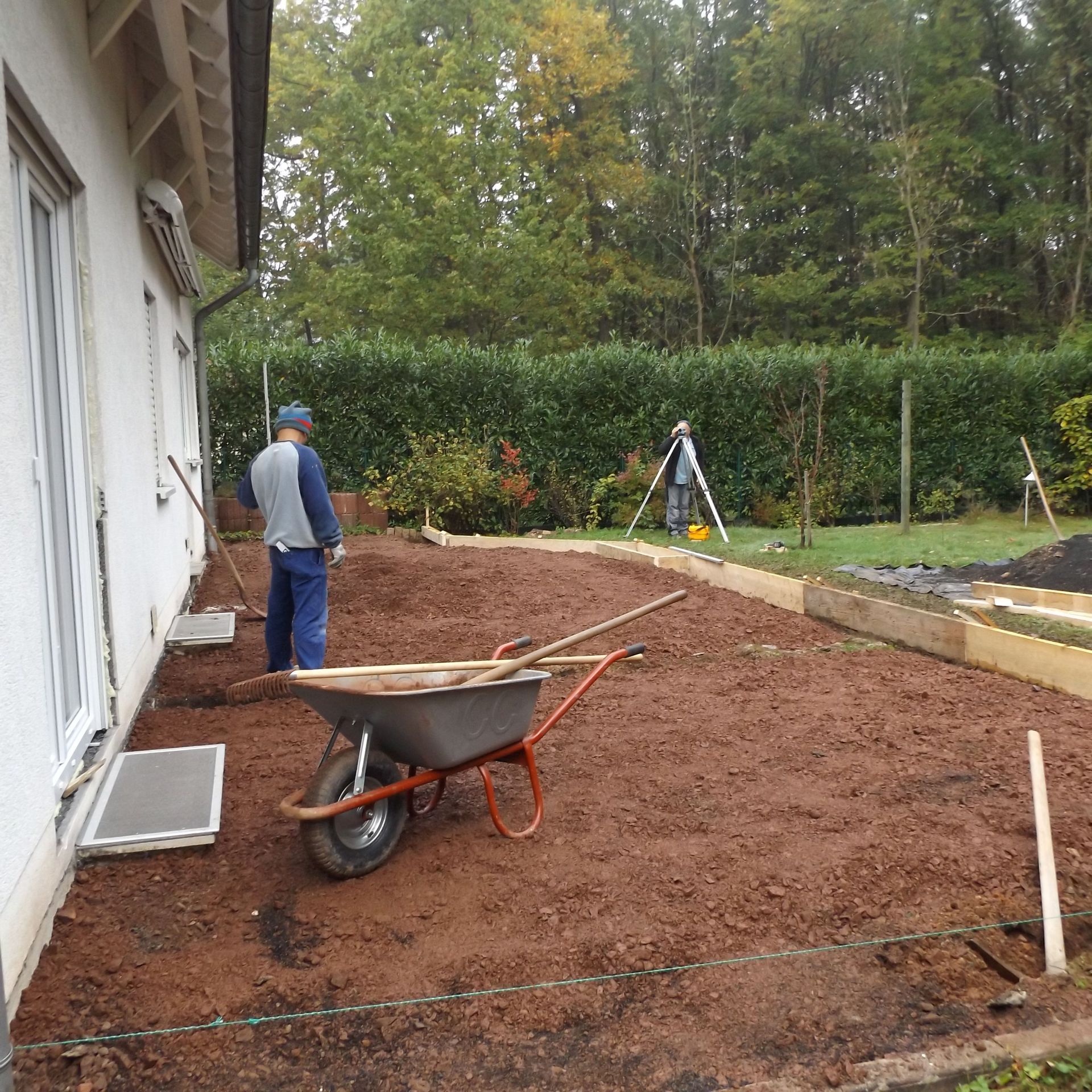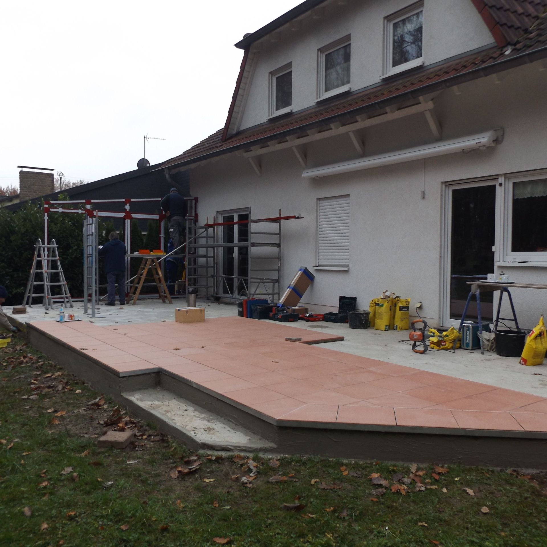 Neuaufbau einer Terrasse mit Terrassenbelag und Wintergarten (während der Arbeit)