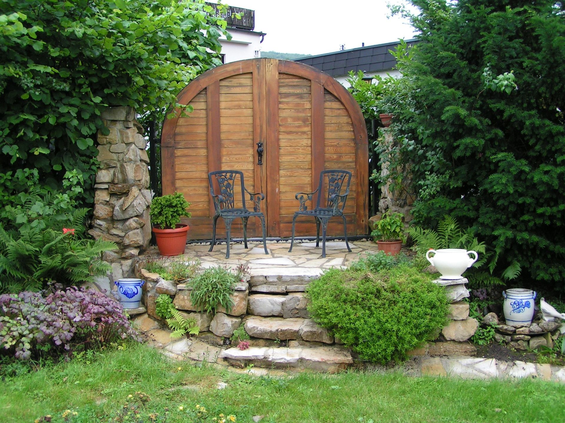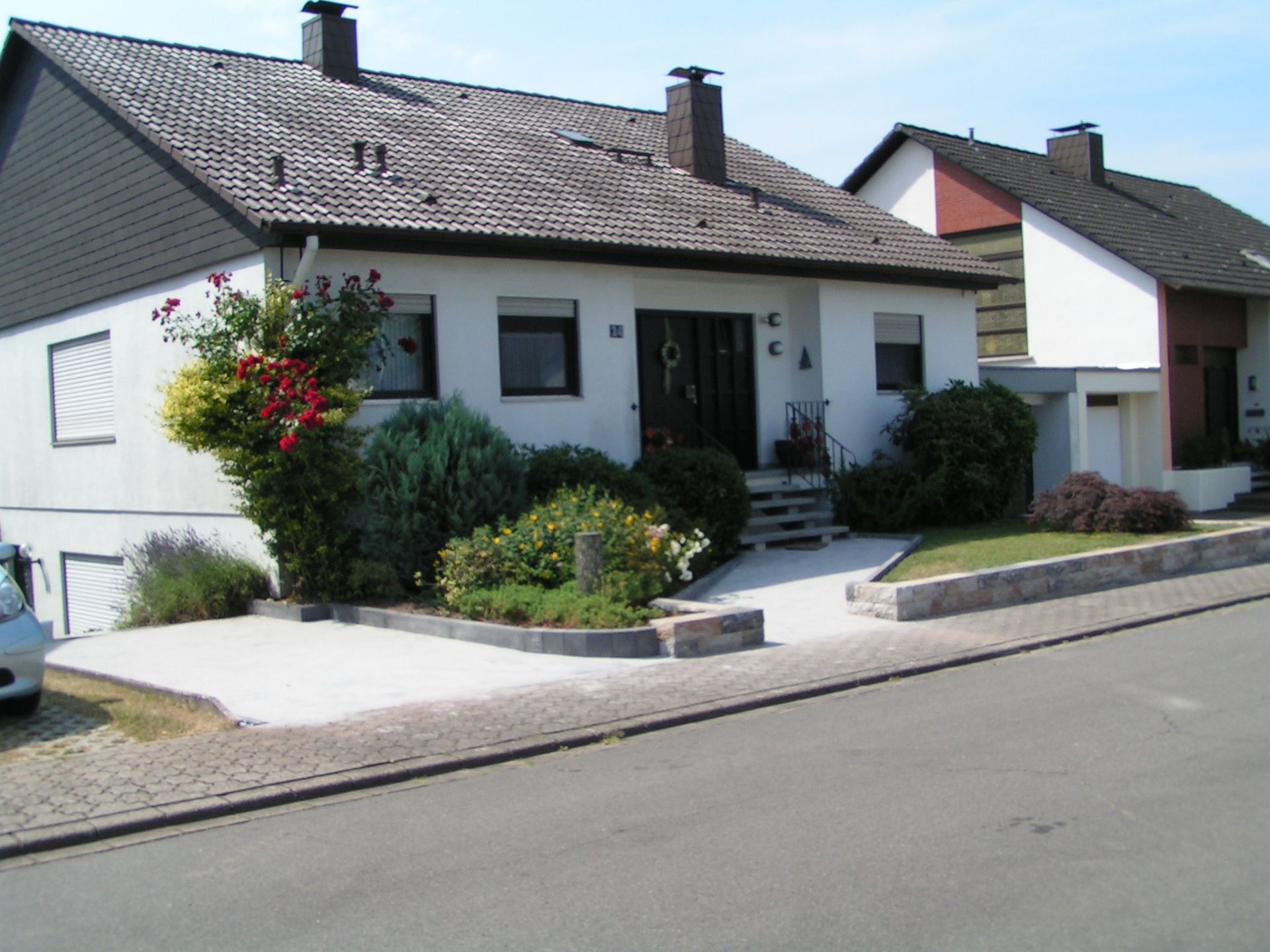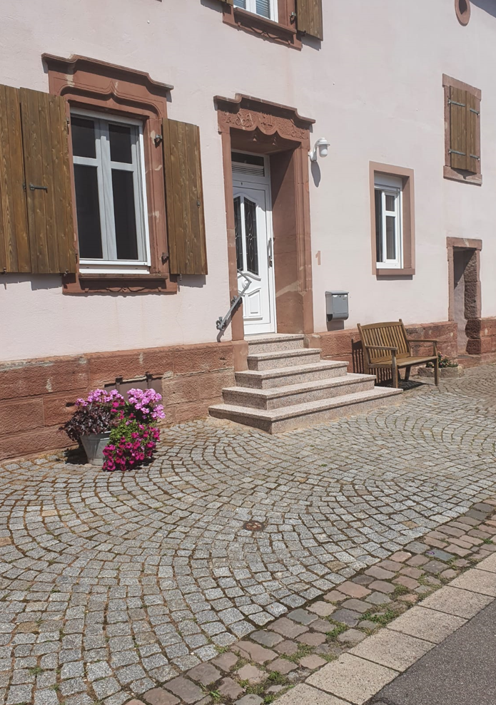 Vorgarten mit Natursteinarbeiten und Gehweg zum Haus